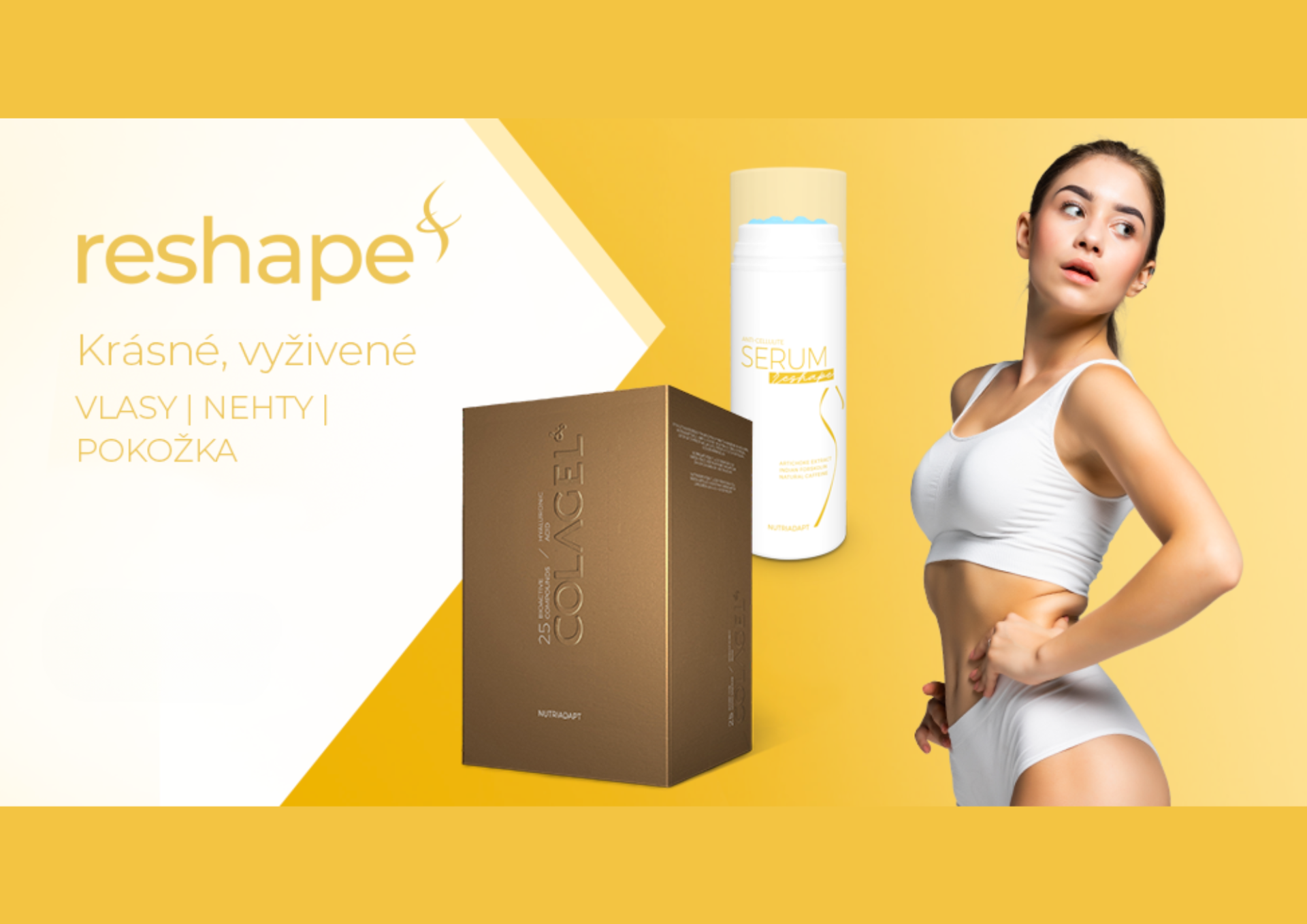 Řada RESHAPE je zaměřená na krásu těla – zpevnění, vyhlazení a viditelné změny na pokožce i postavě. Kombinuje vnitřní výživu a účinnou kosmetiku pro pevnější kůži, méně celulitidy a mladší vzhled.